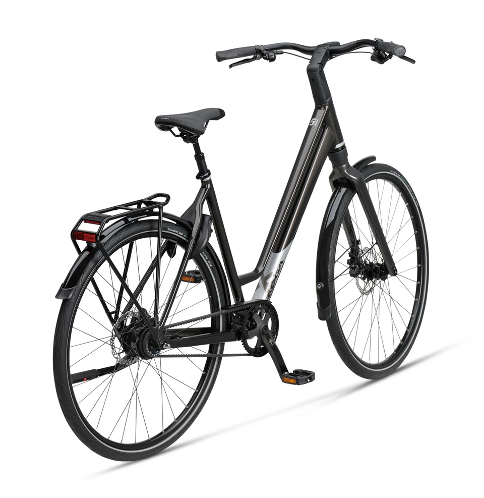 Op technisch vlak is gekozen voor de absolute top in onderhoudsvrije onderdelen. De fiets wordt aangedreven door een duurzame Gates riemaandrijving (belt drive), die fluisterstil is en nooit gesmeerd hoeft te worden. Schakelen doet u met de hoogwaardige Shimano Alfine 8-speed naaf. Deze is niet alleen duurzamer dan de standaard Nexus-naaf, maar loopt en schakelt ook aanzienlijk lichter en directer. Met de krachtige hydraulische schijfremmen behoudt u in alle weersomstandigheden de volledige controle over deze luxe stadsfiets.