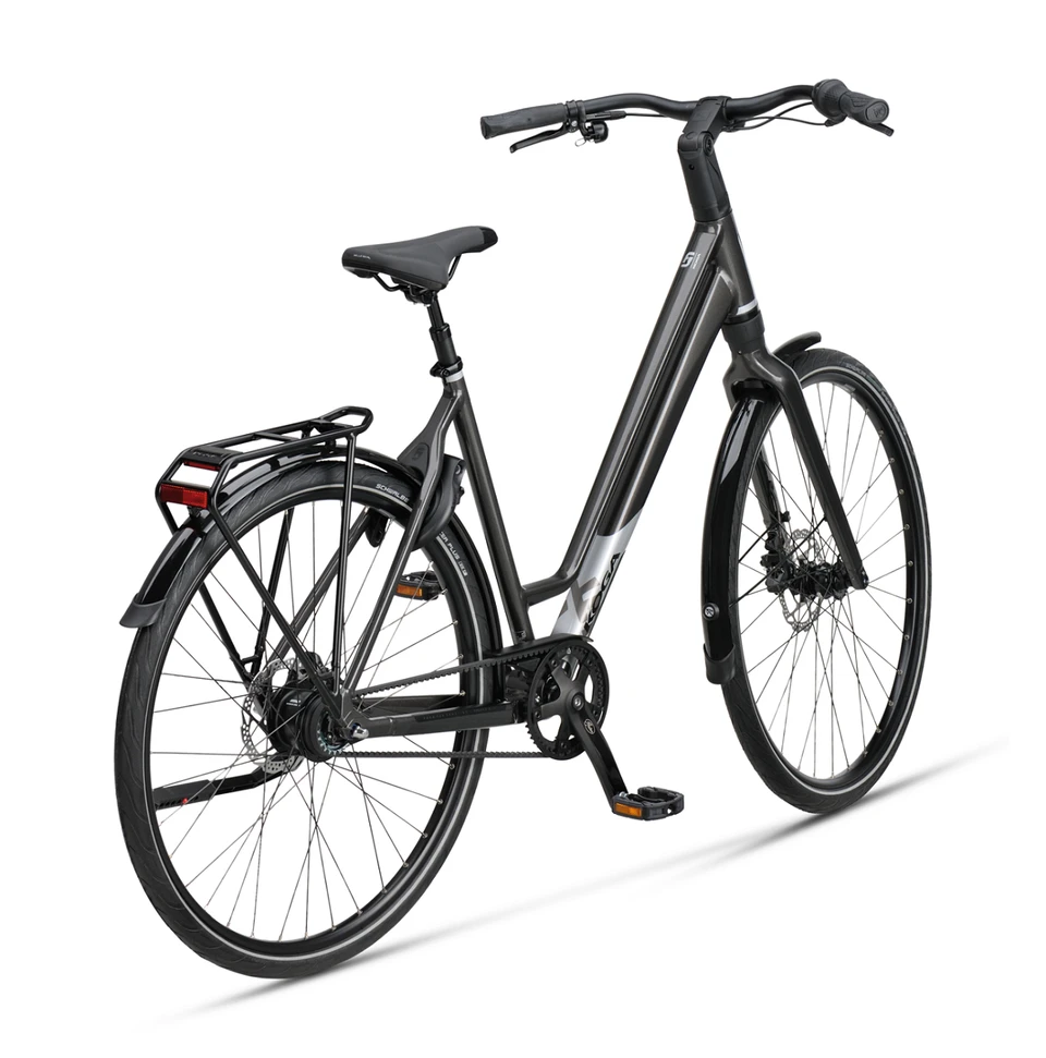 Technisch is deze stadsfiets ontworpen voor maximaal gemak en minimaal onderhoud. De traditionele ketting is vervangen door een duurzame Gates riemaandrijving; deze is fluisterstil, roest niet en gaat tot wel drie keer langer mee. Schakelen verloopt soepel via de betrouwbare Shimano Nexus 8 naafversnelling, die perfect geschikt is voor zowel vlakke ritten als heuvelachtig terrein. Met de krachtige hydraulische schijfremmen en automatische verlichting via de naafdynamo gaat u bovendien altijd veilig op pad.